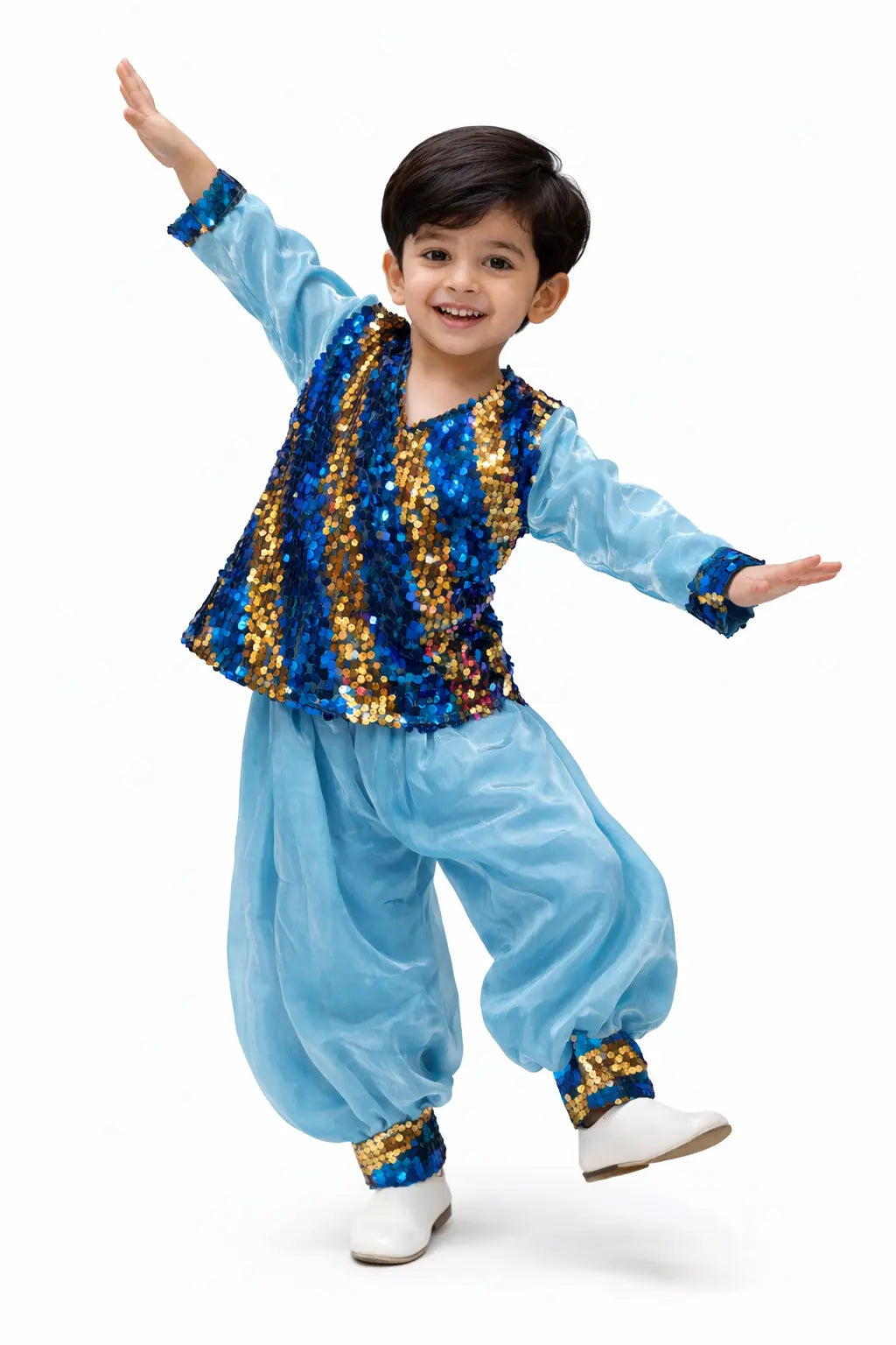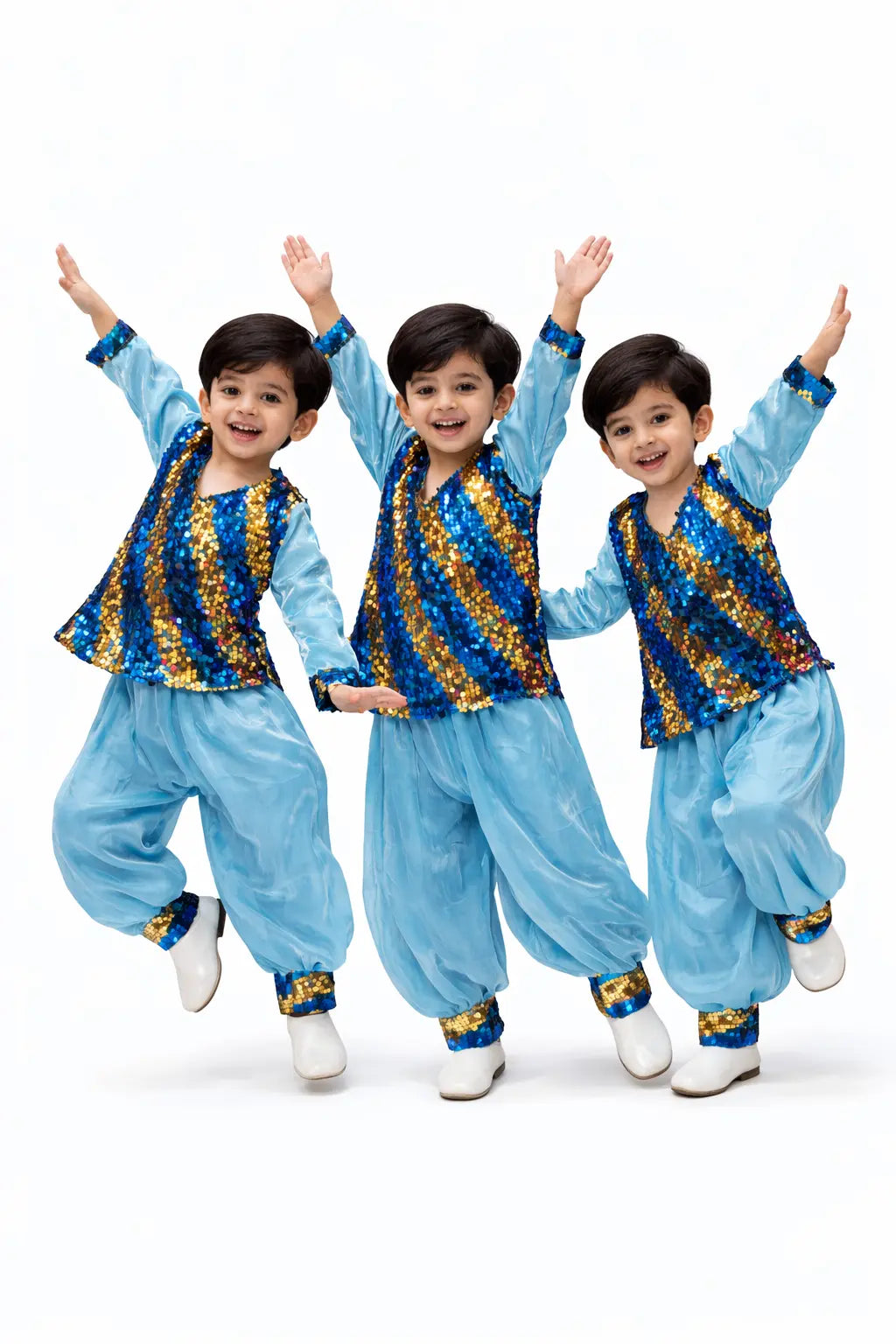 Make your little star shine on stage with this stunning Blue Sequin Dhoti Kurta western dance dress Costume for Boys. Designed specially for school functions, dance performances, fancy dress competitions, and festive celebrations, this outfit combines comfort with eye-catching style.