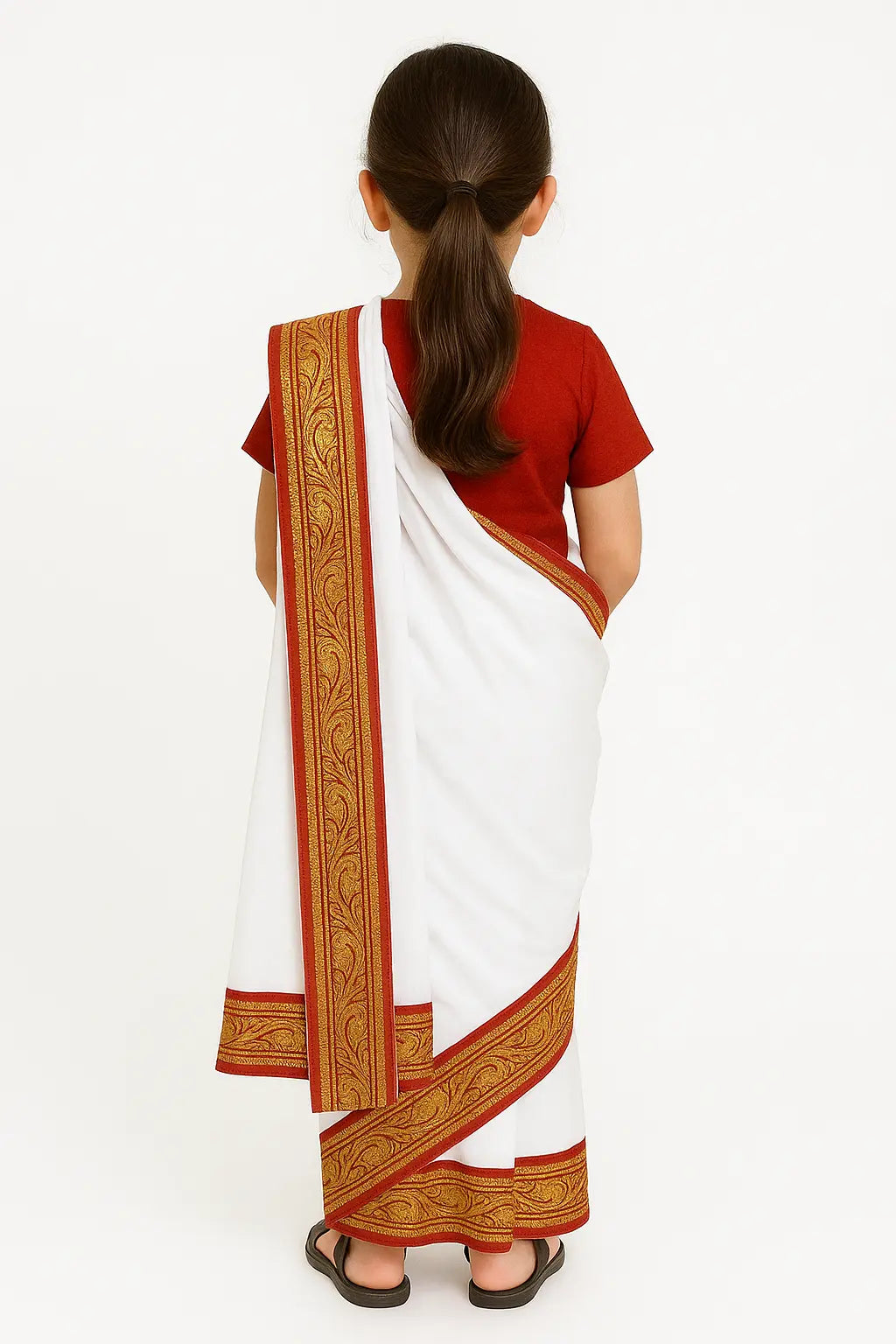 Bengali Saree State Theme Fancy Dress Costume For Girls| Durga Puja Special Dress Product Specifications: Garad sarees usually come in red and white or off-white colour combinations. They are often called as the famous Lal-Par saree due to the staple colour combo of red and white