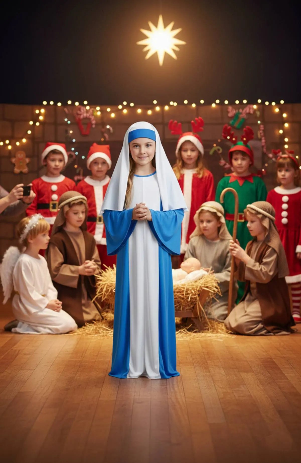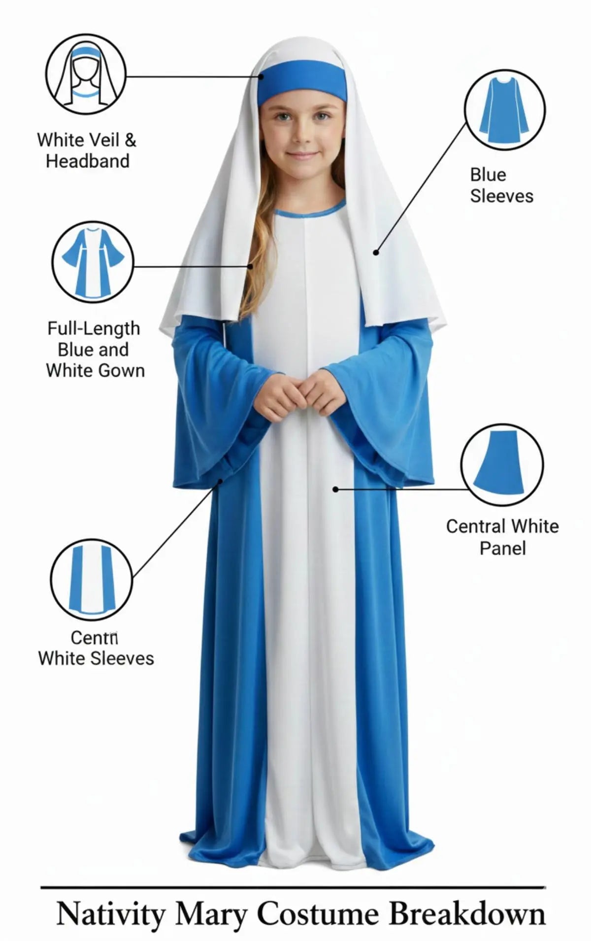 This Mary costume is elegant, picture-perfect, and thoughtfully designed to help children look confident and graceful on stage. The flowing gown and traditional veil create a complete and timeless Nativity look.