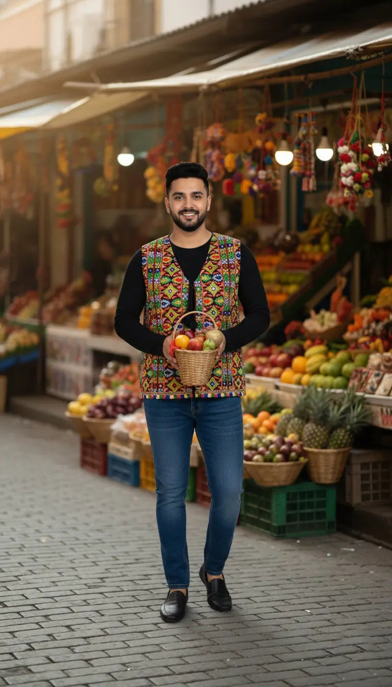 Add a touch of traditional elegance to your wardrobe with this stunning Rajasthani Men's Jacket from Fancydresswale. Crafted from high-quality cotton, the multicolored jacket features intricate patterns inspired by the vibrant culture of Rajasthan. This versatile piece also includes a heavy Kacchi Aari Koti, showcasing exquisite Aari embroidery for a sophisticated look. Whether for festive occasions, cultural events, or casual gatherings, this jacket is perfect for making a stylish statement while staying comfortable.
